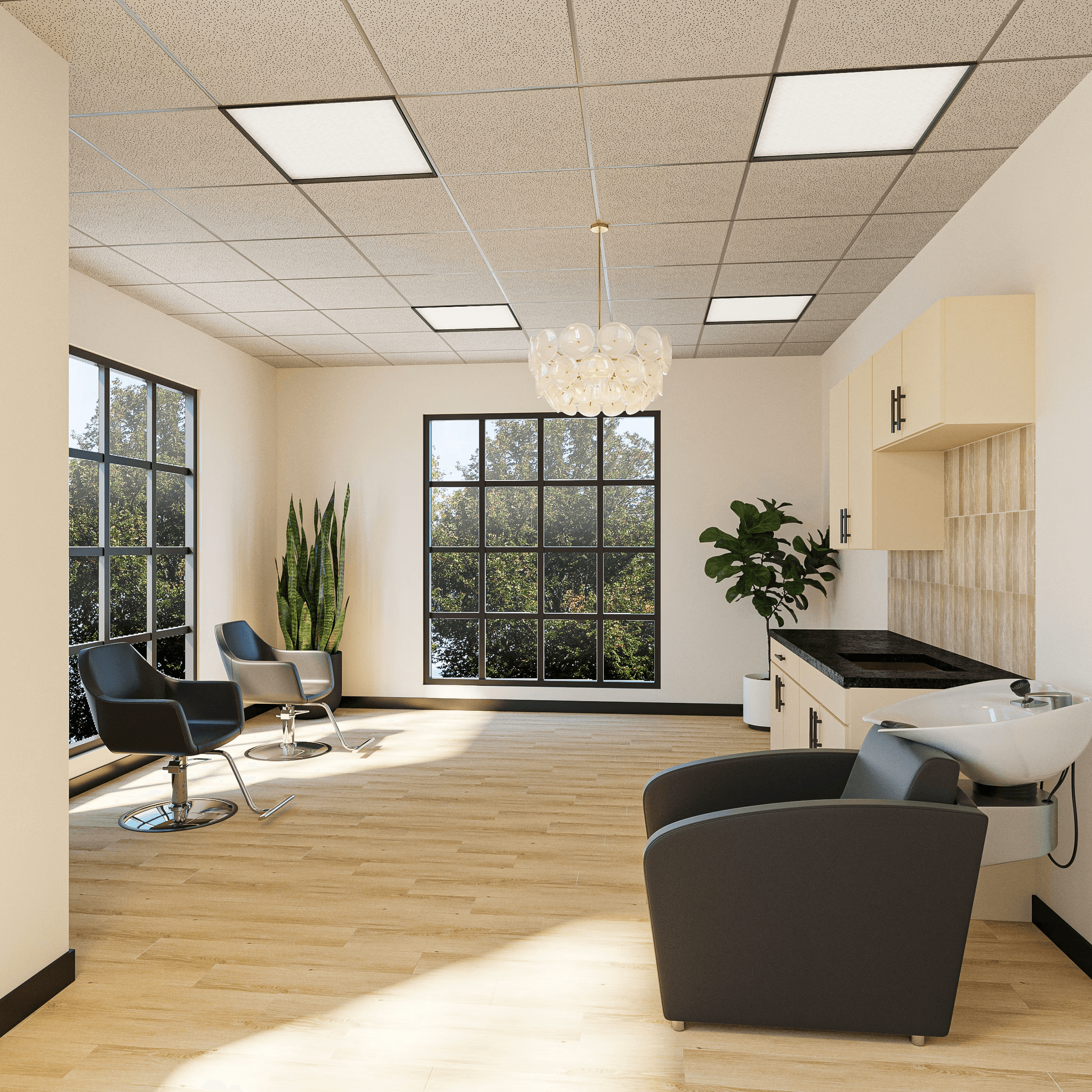 Each suite is crafted with premium lighting, built-in sinks, modern cabinetry, and plush salon furnishings — creating a sophisticated environment that reflects your professionalism and ambition.